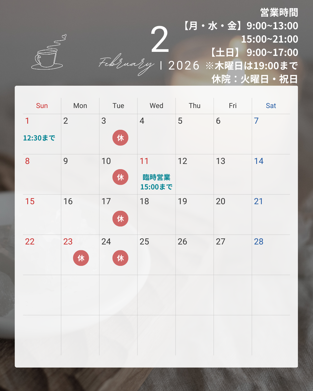 ●2/11(水・祝)は15:00まで(臨時営業)
